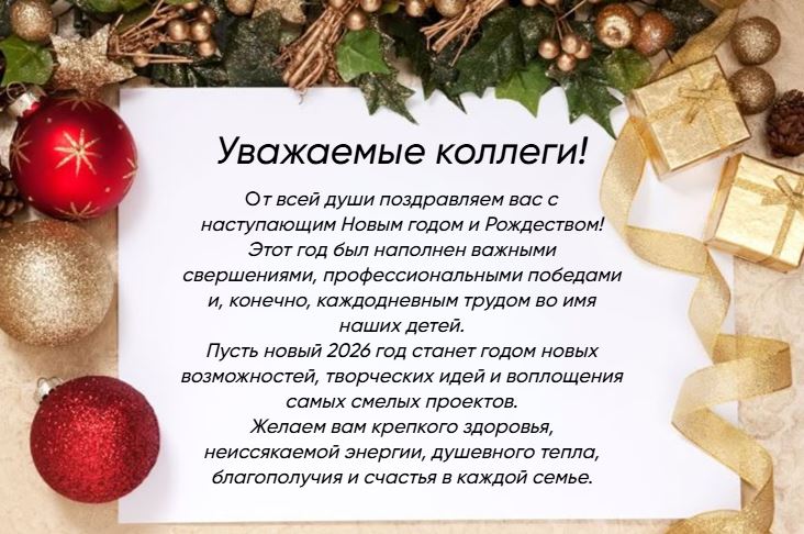 Уважаемые коллеги! От всей души поздравляем вас с наступающим Новым годом и Рождеством! Этот год был наполнен важными свершениями, профессиональными победами и, конечно, каждодневным трудом во имя наших детей. Пусть новый 2026 год станет годом новых возможностей, творческих идей и воплощения самых смелых проектов. Желаем вам крепкого здоровья, неиссякаемой энергии, душевного тепла, благополучия и счастья в каждой семье.