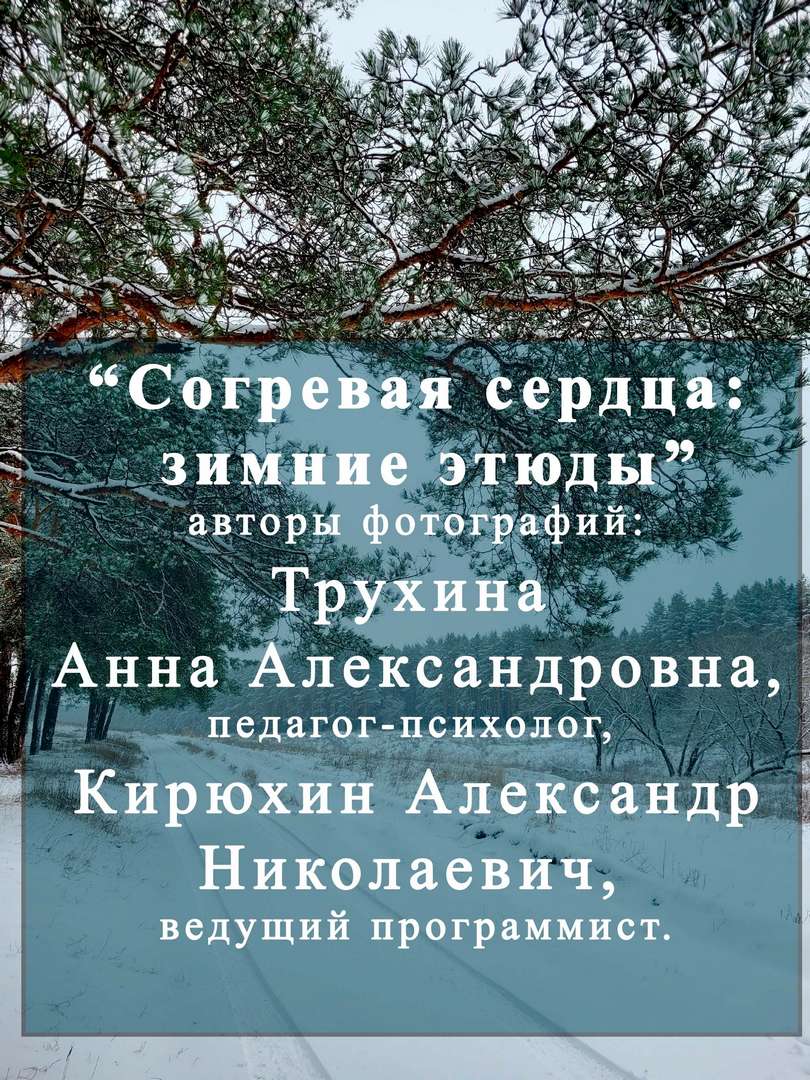 Мы рады приветствовать вас на «Зимнем вернисаже» - творческом продолжении разговора, начатого нами осенью. Предлагаем вашему вниманию работы Трухиной Анны Александровны, педагога-психолога ЦПМПК и Кирюхина Александра Николаевича, ведущего программиста, педагога дополнительного образования ресурсного центра дистанционного образования детей-инвалидов Два автора, два педагога, два взгляда на мир. Эти этюды —диалог света и тени. Днем зима искрится, играя солнечными зайчиками на сугробами расписывая инеем ветви. Ночью она становится величественной и таинственной:лунный свет серебрит снега, а звезды зажигаются свечами в морозном небе.